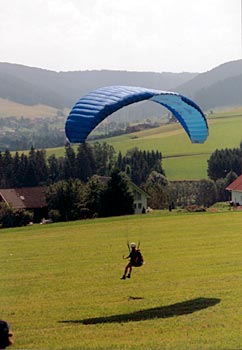 Da kommt ein Schirm den Hang herauf, aber hat jemand den Helmut gesehen? Der muß sich wohl noch unten im Gras ausruhen.